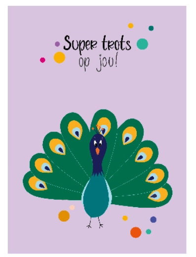 Kaart met pauw 'Super trots op jou!'A6 postkaart gedrukt op 300 grams papier, 100% gerecycled.